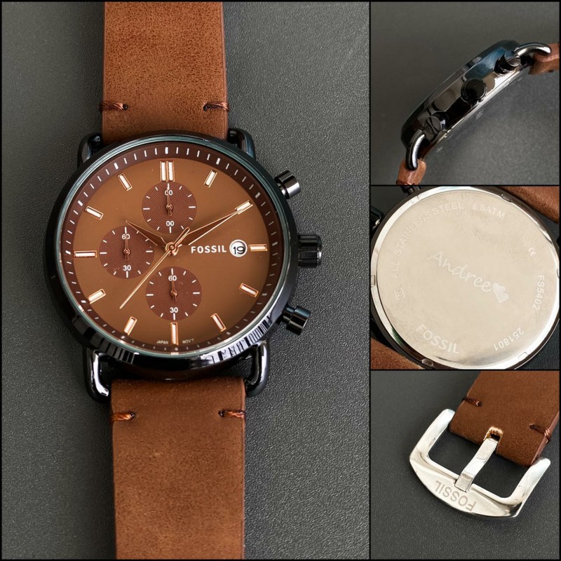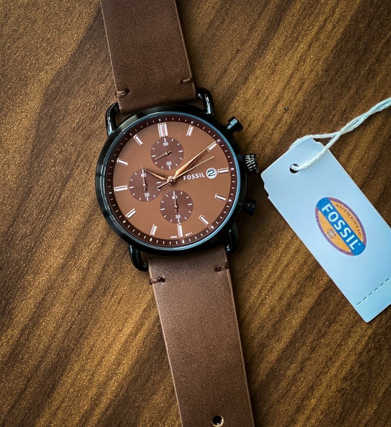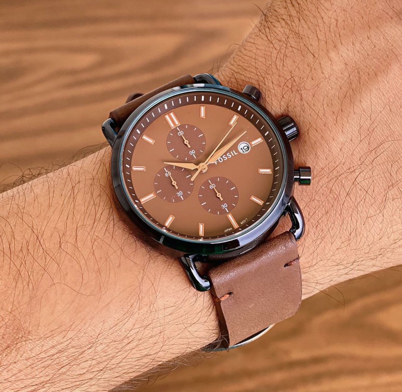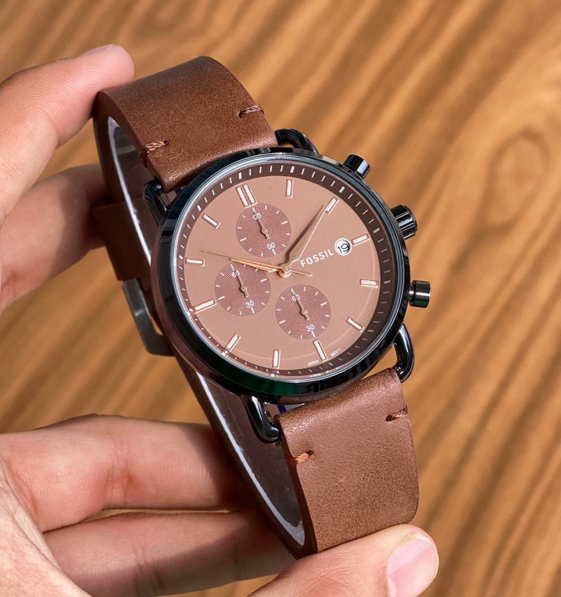 *This 42mm Commuter features a brown satin dial with stick indices, chronograph movement and a formal brown leather strap.*?