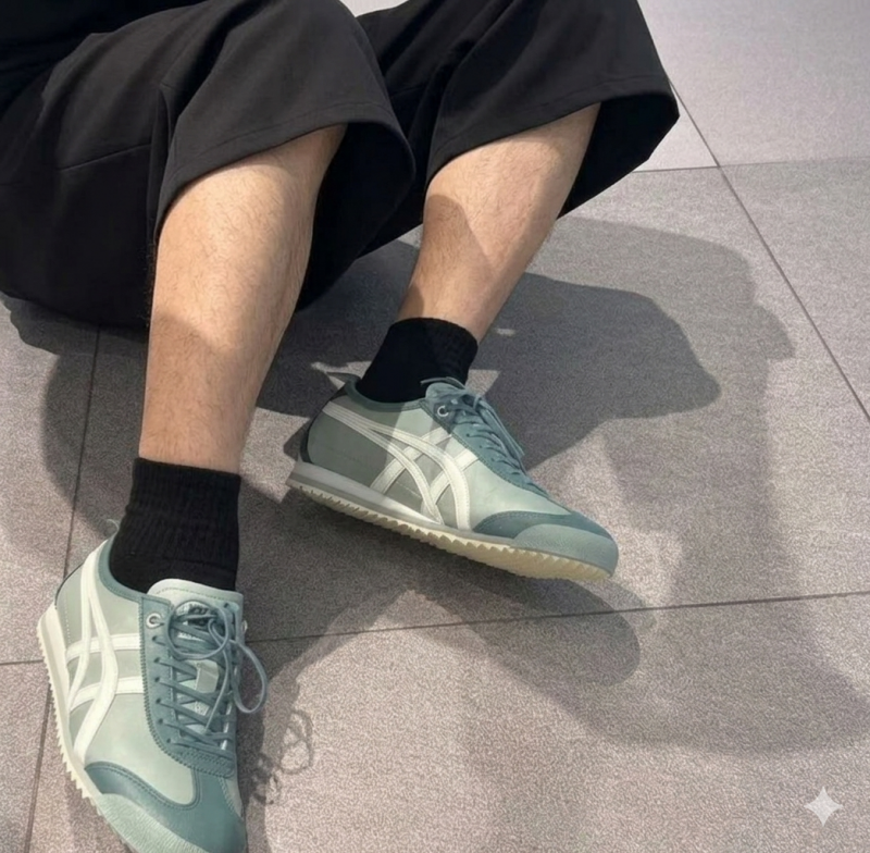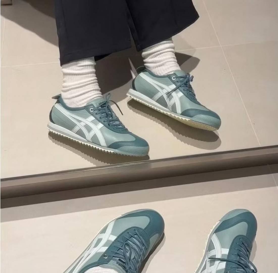 • Luxury Refinements: Features thin, waxed laces and a polished finish. It retains the signature "X" reinforced heel stitching and the functional "Tiger" branded heel flap in a tonal mint or ocean haze.