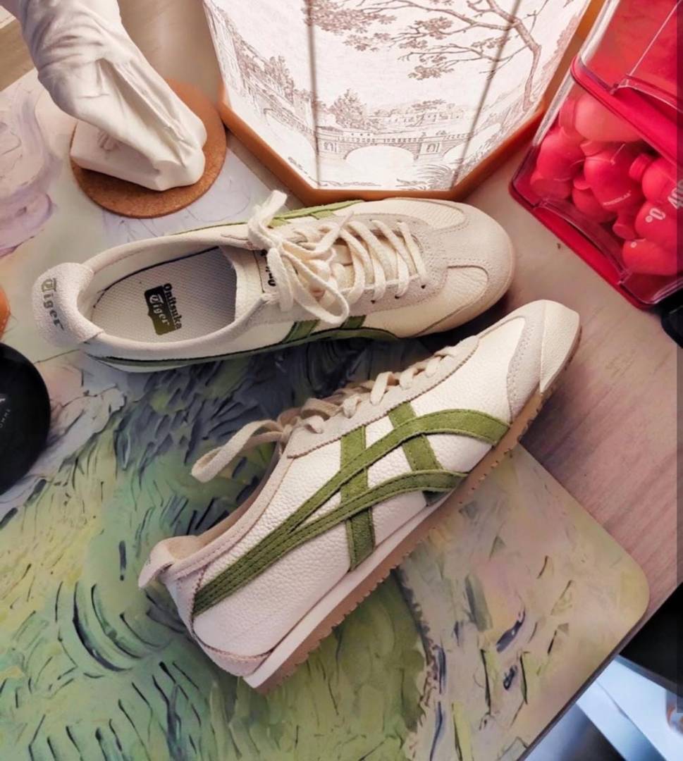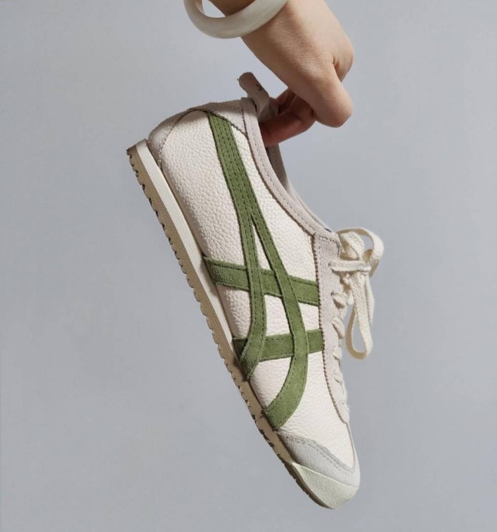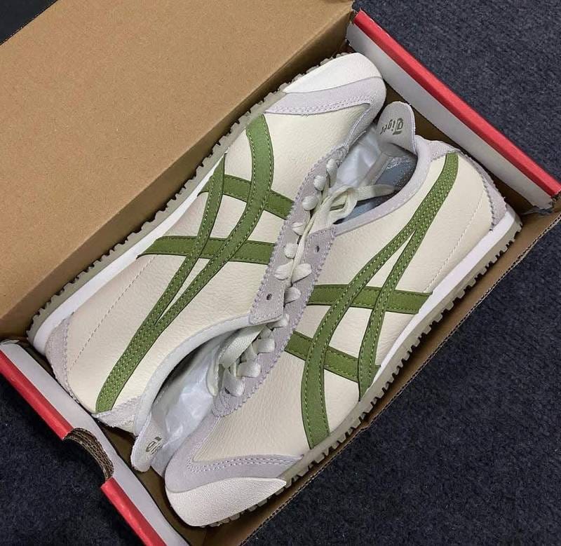 The Onitsuka Tiger Mexico 66 Vintage in "Birch/Cactus Green" is a masterful nod to the brand's 1960s training roots. This 7A Master Quality (First Copy) replica for men features a warm, sandy birch base paired with vibrant cactus green Tiger stripes. The "Vintage" (VIN) treatment gives the leather a softer, matte finish, making it a favorite for those who prefer an organic, earthy aesthetic over stark white sneakers.